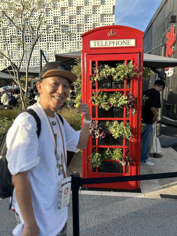 英国館のショップで折り畳み傘を自分土産に購入し、電話BOXの前でパチリ☆